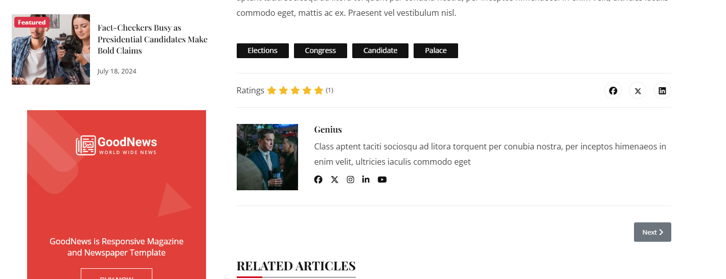 To change each author's image, edit the contact (the contact must have the real name, as suggested in the demo) and select the image. From the Display tab, you can add social media links if you wish; otherwise, remove the social media icon classes that come with the demo. Finally, your authors will appear on a page like this: demo.unitemplates.com/goodnews/index.php/authors . When you access each author's page, you'll see their details and articles.