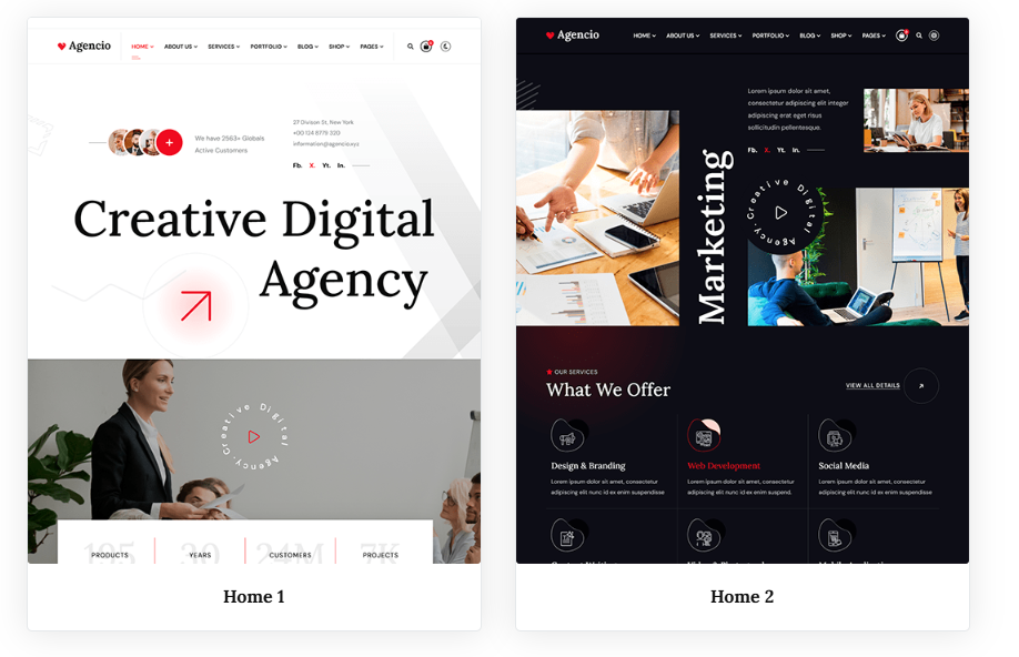 Although the Agencio Template page shows a dark mode with black background, the demo has a white background in both Home 1 and Home 2 pages.